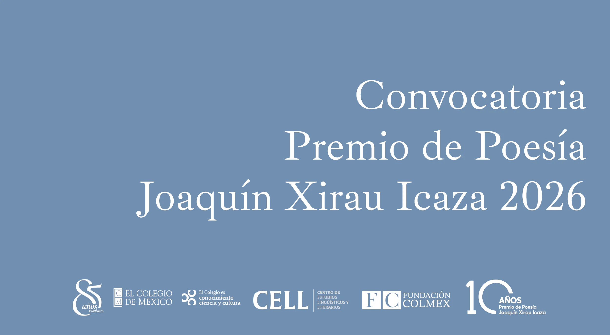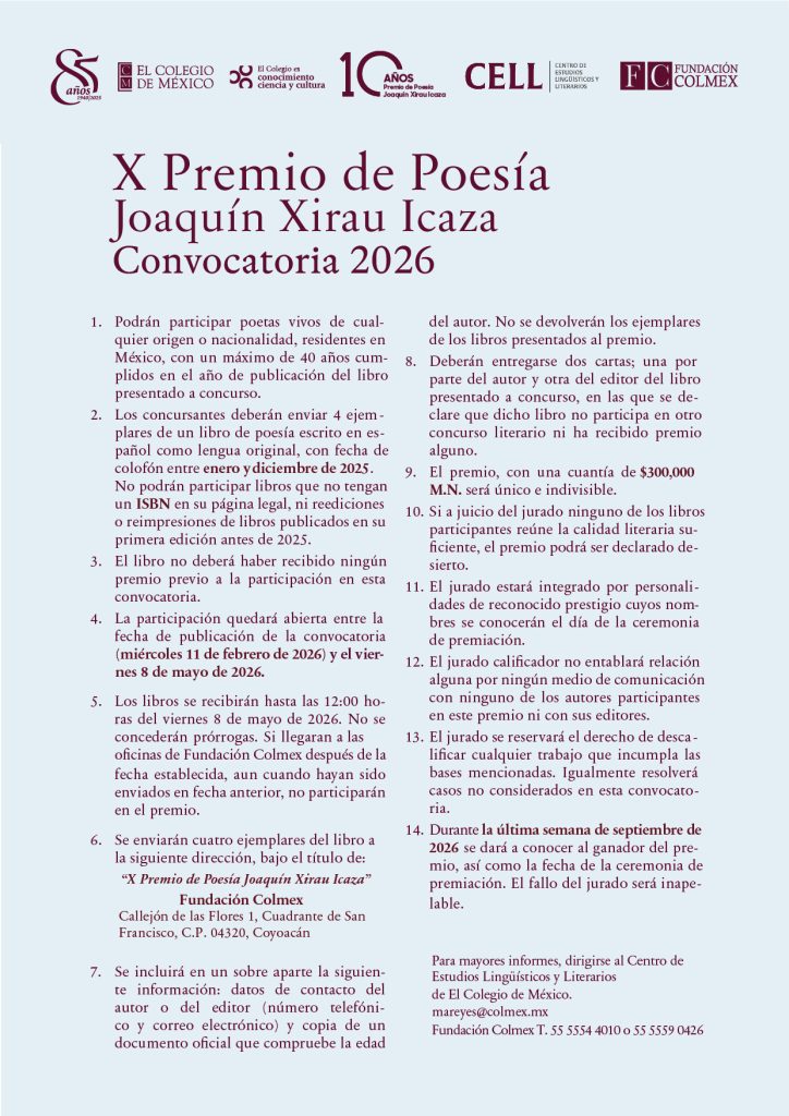 La poesía joven en México encuentra nuevamente un espacio de impulso y reconocimiento con la apertura de la convocatoria al X Premio de Poesía Joaquín Xirau Icaza 2026, una iniciativa impulsada por El Colegio de México y Fundación Colmex, a través de su Centro de Estudios Lingüísticos y Literarios.